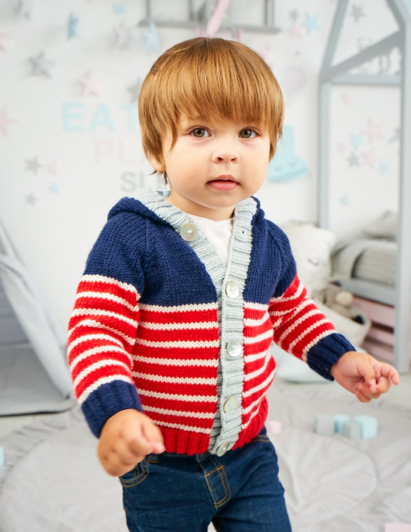 This unisex, hooded cardigan is a great project for an advanced beginner knitter who wants to practice stripes and test a few new techniques.