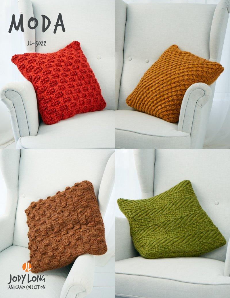 These four pillows all feature different textures on the front. The backs are all in rib stitch, with a buttoned opening for easy removal.