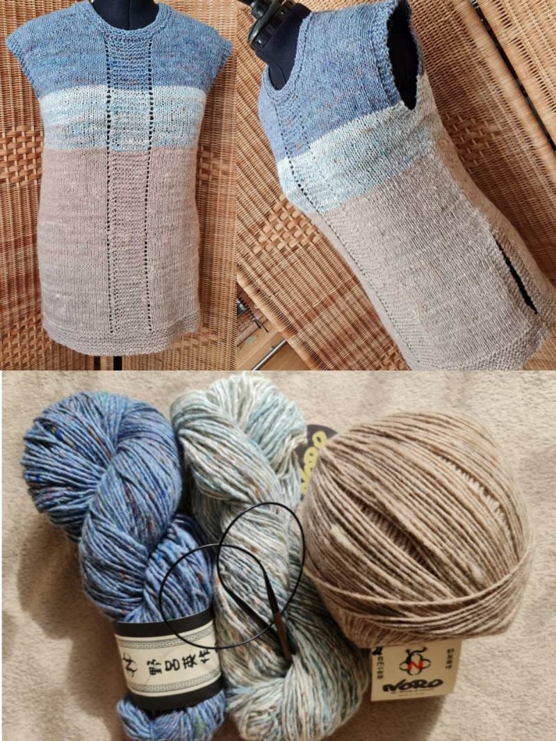 Der Westover ist einfach gerade gestrickt, von unten nach oben: zuerst in Reihen, nach den Schlitzen in Runden und dann ab den Armausschnitten wieder in Reihen. Du strickst also sehr viele einfache rechte Maschen.