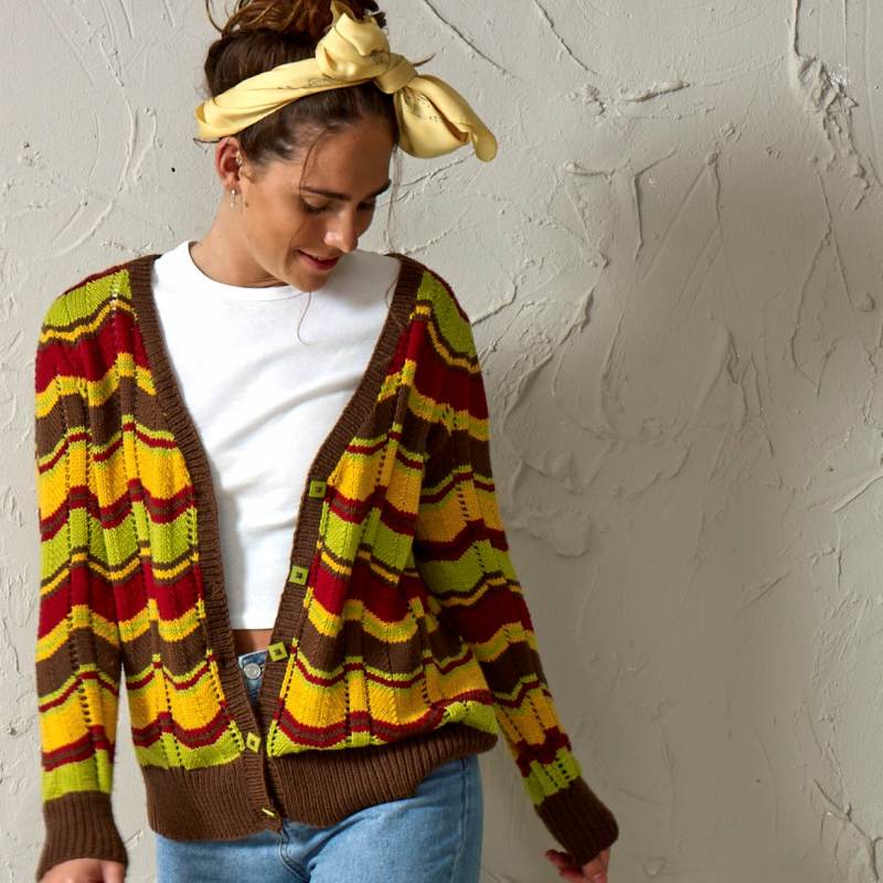 Bettina is a long sleeved, v-neck cardigan knitted in a combination of stripes and chevron pattern.