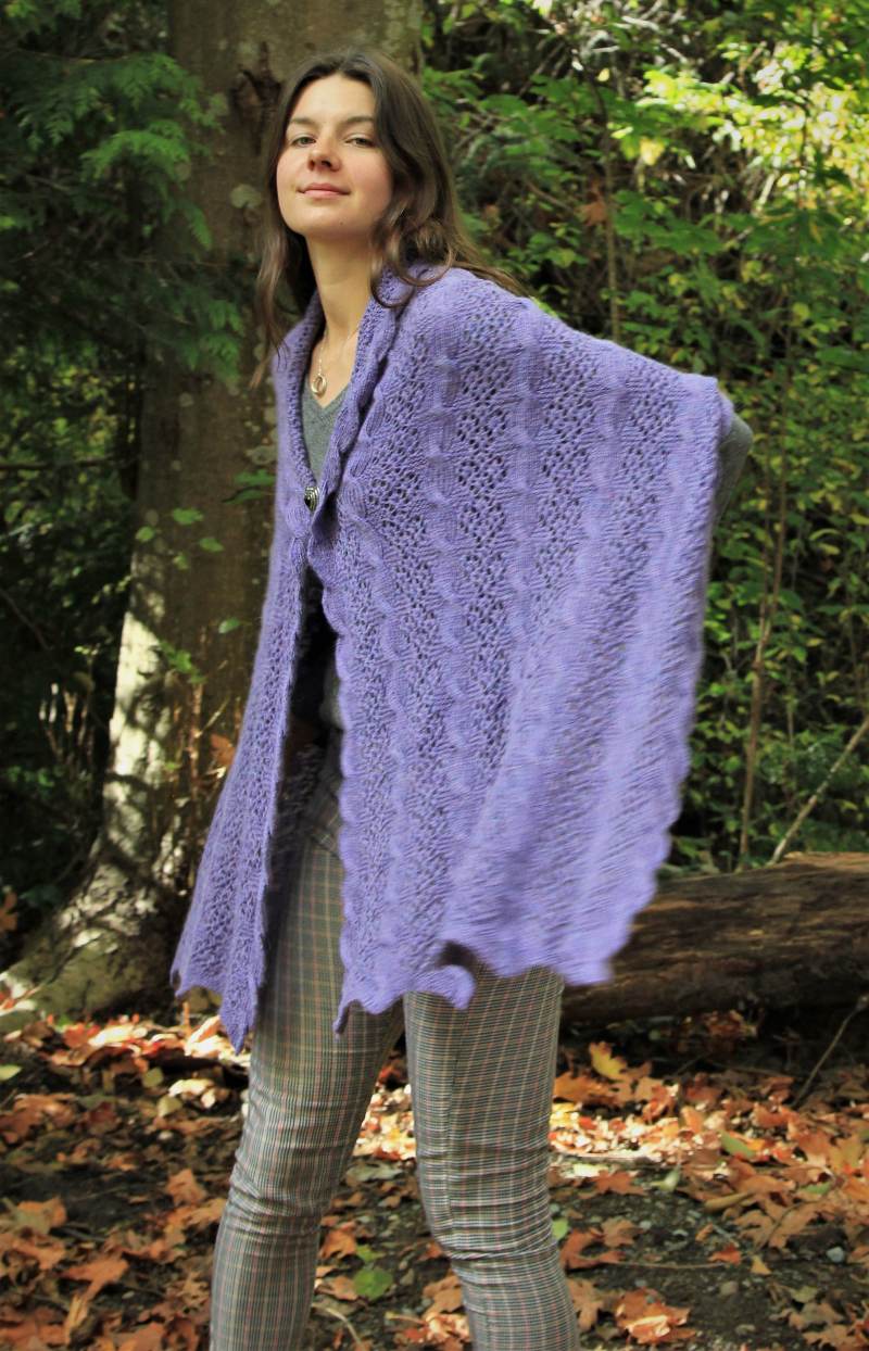 So here is my new travelling stole, cables and lace, squishy, long, and completely reversible.
