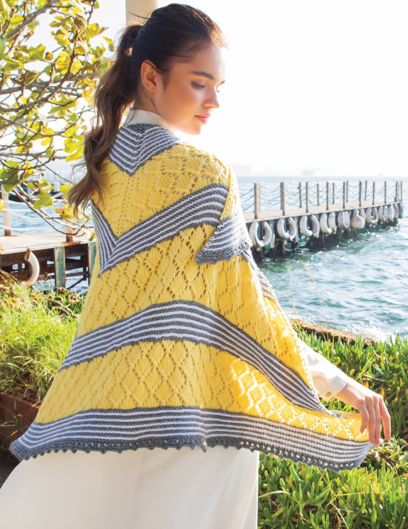 Knit top-down from a garter tab start and finished with a picot bind off. All text
