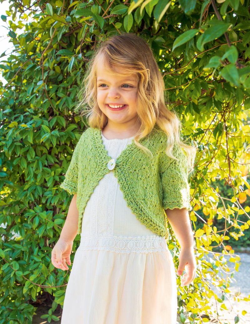 The textured stitch on this bolero is created by knitting into a stitch a few rows below. The lace border on the body is knit separately and sewn into place.