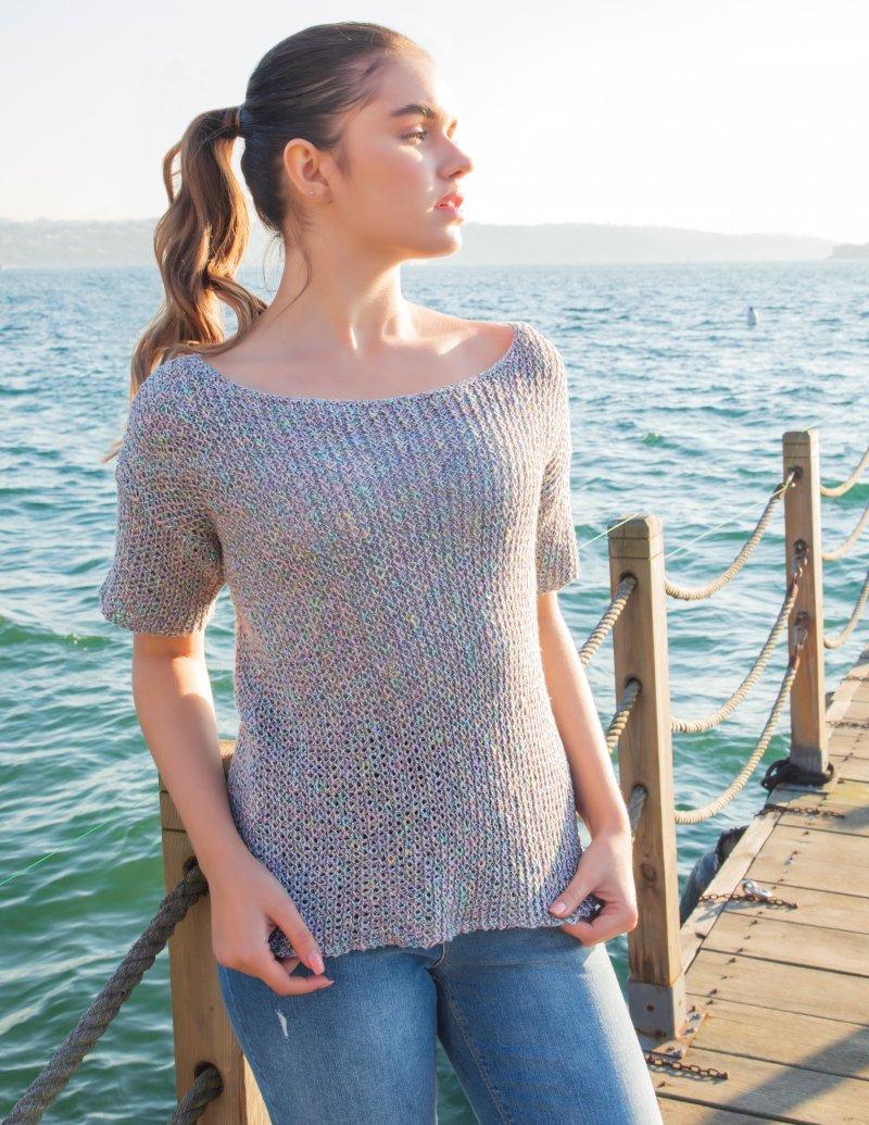 This top uses the condo knitting technique (two different sized needles) to create an airy fabric.