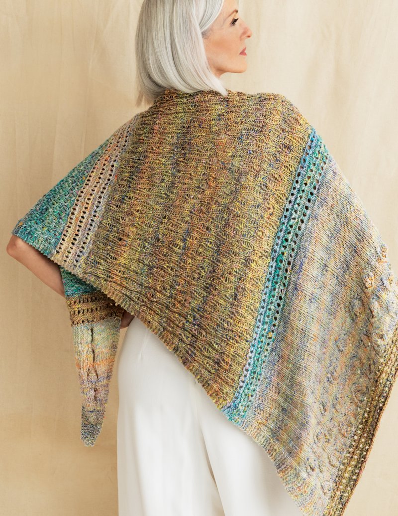 Bands of eyelet ridges, poetic rosebuds, wrapped stitches, and allover eyelet/drop-stitch patterns create a statement in texture.
