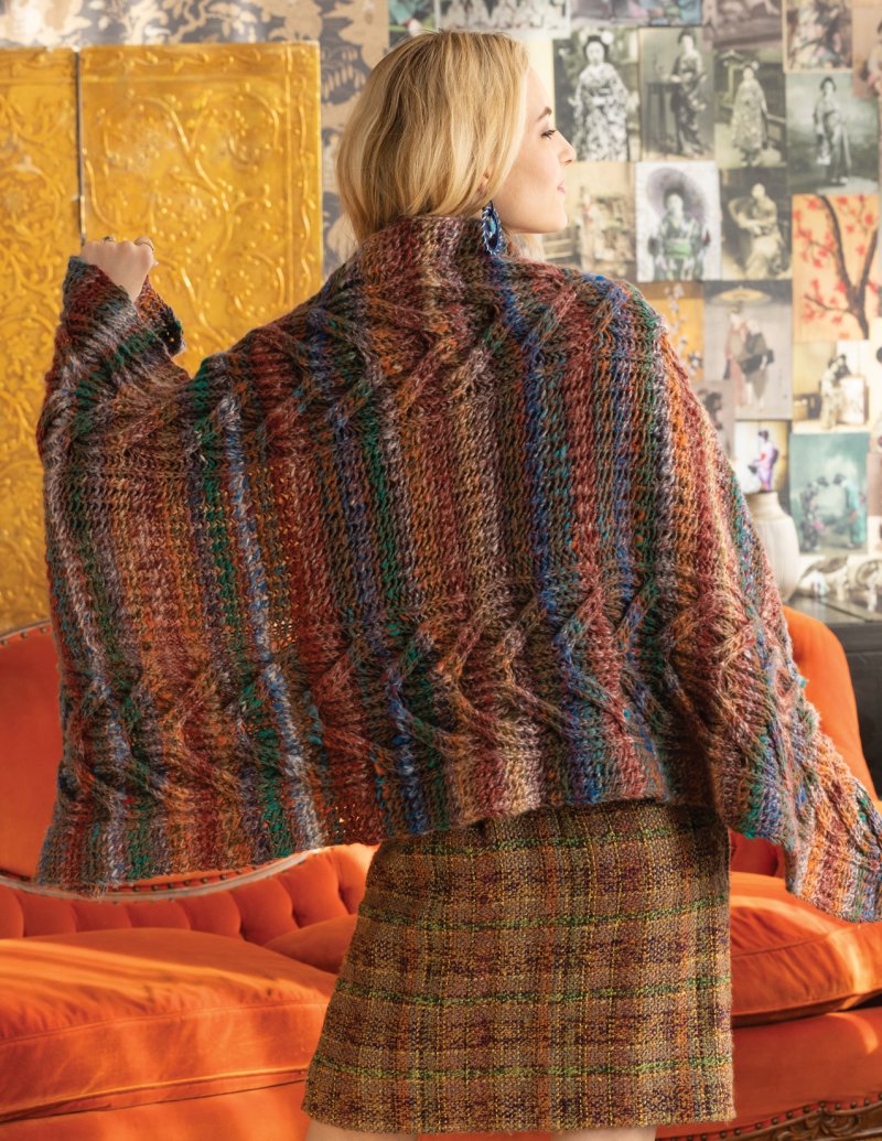 Staghorn-inspired cables, nestled between brioche stitch, run the length of this shawl in opposite directions.