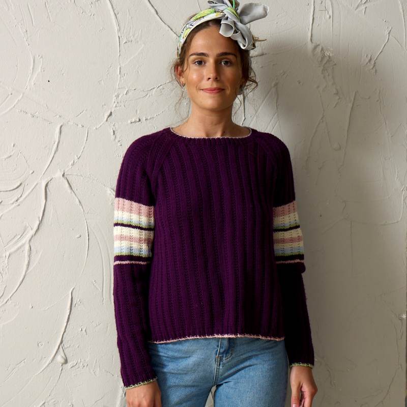 Amelie is a round necked long sleeved sweater. It features a rib pattern and stripes on the sleeves and rib edgings.
