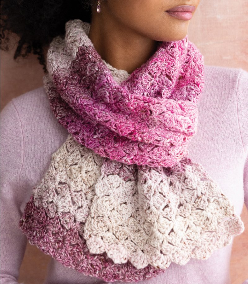 Pairing a simple pattern with a yarn that has a beautiful gradient is an easy way to give any project a little extra pow. Here, shells slant left and right across shifting pink tones.