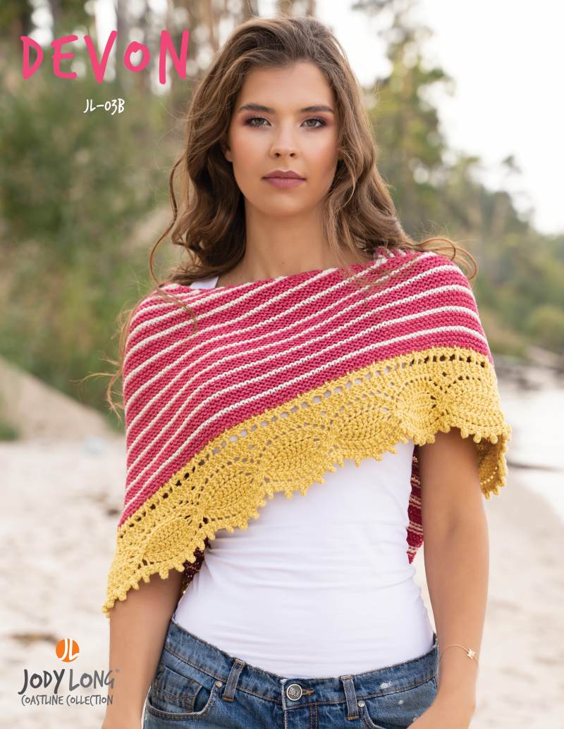 The cabled border of this triangular shawl is knit first. Then stitches are picked up to knit the striped body.