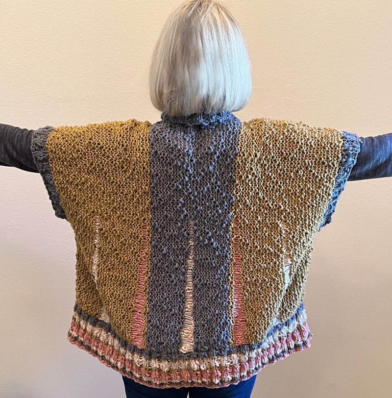 An oversized poncho, knit flat sideways.