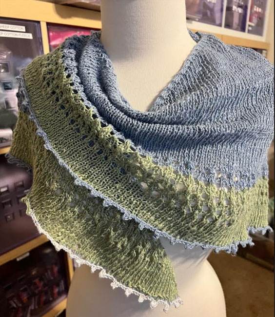 Top down Shawl with lots of drape. Starts with a no hump tab . Increases form an interesting pattern in the center of the back. The contrasting border add interest and the picot bind off adds a nice detail