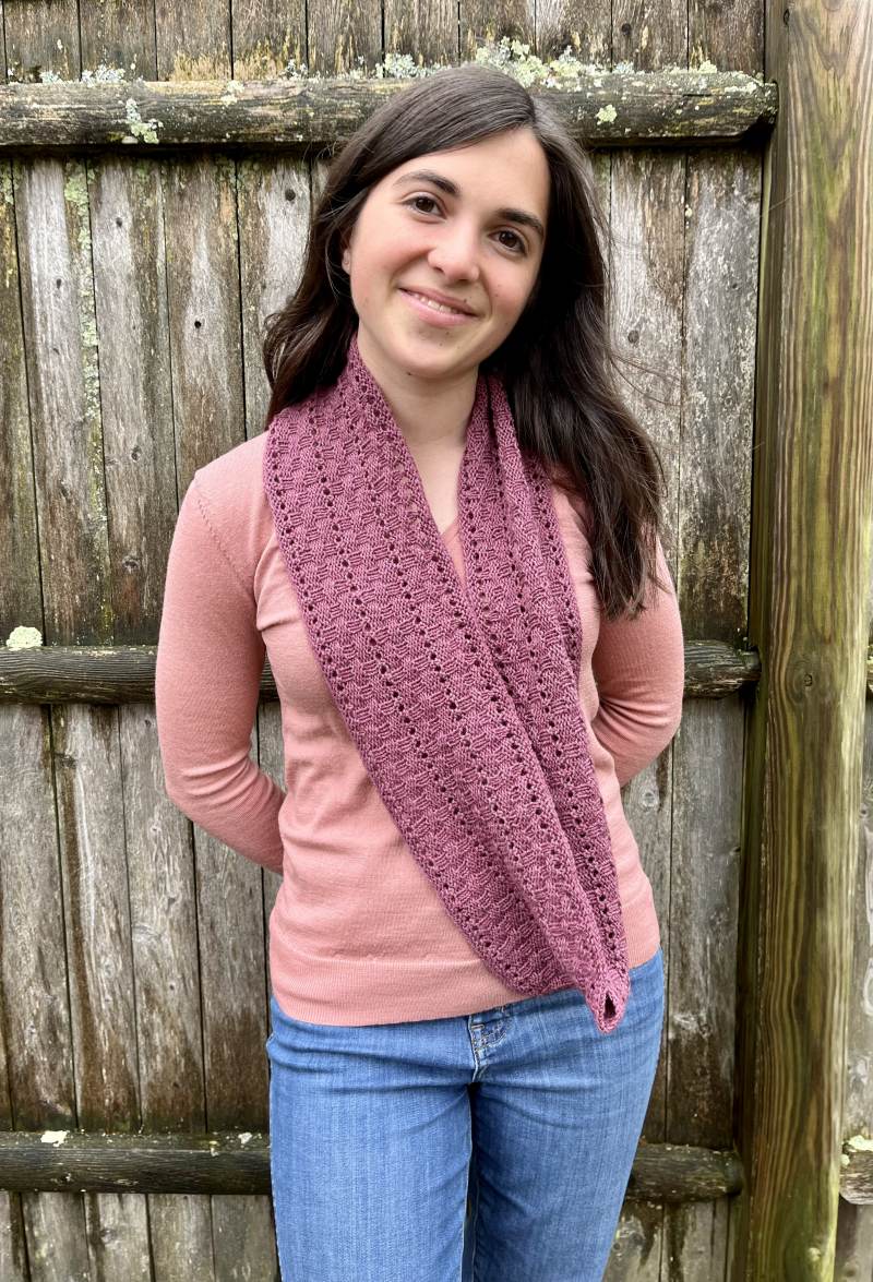Cowl is worked in the round on US 6 4.0 mm circular needle and features brick like texture pattern alternating with a simple eyelet pattern, and complemented by garter borders. Cowl pattern includes instructions for 4 different lengths-Relaxed Loop, Close Loop, Double Loop and includes modifiable depth options. Photo demonstrates Relaxed Loop, which can also be doubled ( See photos on Ravelry).