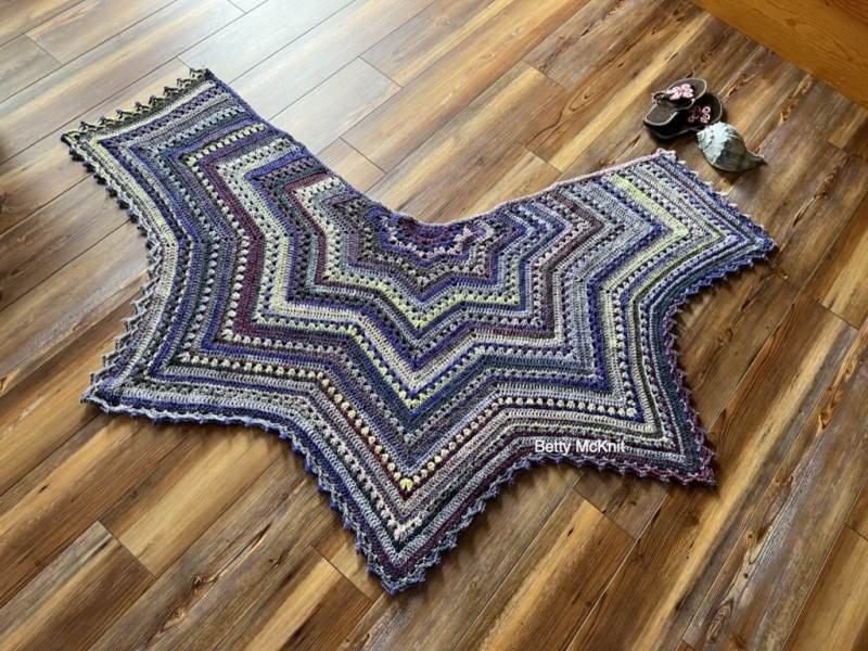 This pattern is an adaptation of the 6-Day Star Blanket and 6-Day Star Shawl by Betty McKnit adapted especially for Noro Yarn. It creates a stunning, slightly more than half-circular star-shaped shawl with five large points and a unique border.