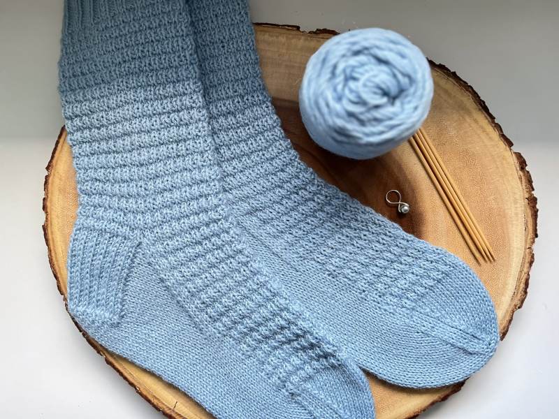 Feel free to explore different techniques for constructing your preferred heel and toe as you knit these socks. Add your personal touch to each wave and make them truly unique!