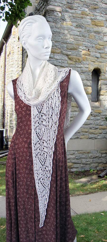 Long narrow shawl worked in two pieces, then joined. The edging along the shaped edge has beads added while knitting.