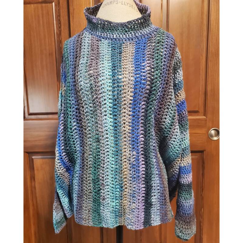 This sweater is a quick and very easy crochet pattern. It took me 3 days to make the pieces. I used Noro Tsubame for this one as I wanted to have a no think color changing project. It only takes 2 balls, but every bit of them for the largest size. Larger sizes can be achieved by wet blocking and pinning.