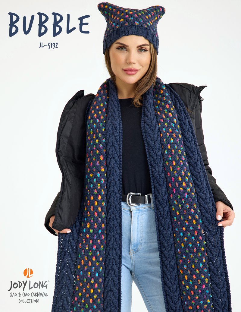 Completed scarf measures 24 cm (9½ in) wide and 190 cm (74¾ in) long.