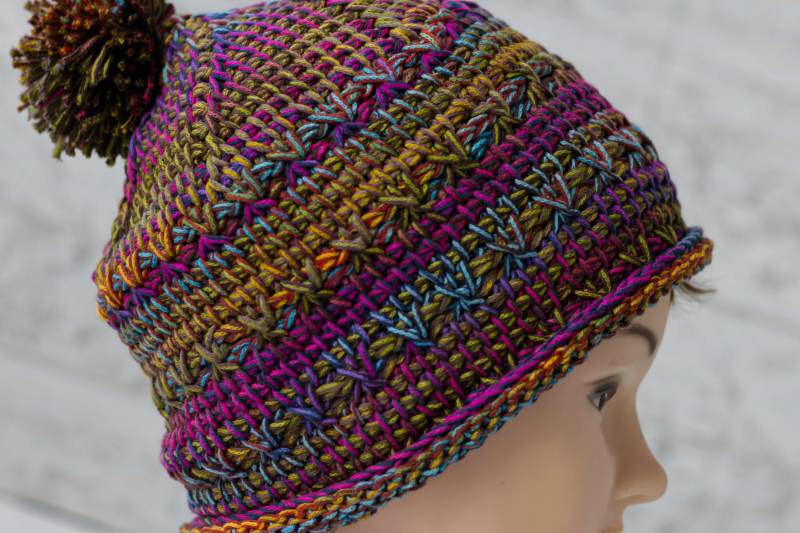 The North Star Hat has enough texture, because of this yarn, to show the star row. Works up fast with just one ball of Queensland Cairns yarn. Any worsted-weight yarn that shows off texture stitches would be great for this hat project. The North Star Hat uses the Tunisian simple stitch throughout. Cairns yarn is beautifully colored and has a chain strand showing off its colors even more. This yarn is a cotton blend, perfect for those who prefer no wool.