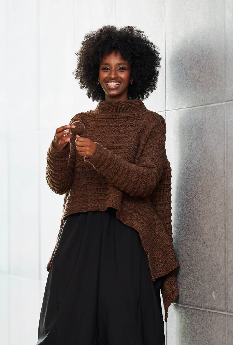 Japana whispering in Japanese - is a high-low pullover in a ridge pattern with swinging side panels that ends in a high standing collar. The side panels are picked up and knitted after the side seams are done. Wear it as you like hanging loose or gathered with a belt or with a shawlpin at the front. Japana is knitted in the lovely wool and silk yarn Madara from Noro.
