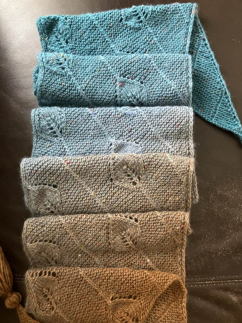 Fronde is Italian for leaves and in this pretty scarf the leaves grow from stems that go across the garter stitch background. By increasing and decreasing at both ends of the right side rows, a bias effect is achieved and when combined with a slow colour changing yarn, a beautiful scarf is created.