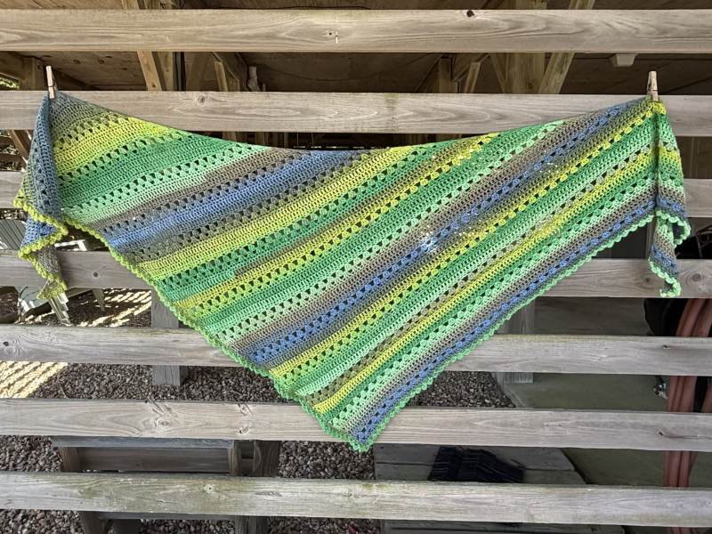 The Tranquil Tides Wrap truly shines when made with self-striping yarn, showcasing the gorgeous colors of Juniper Moon Farm yarns.