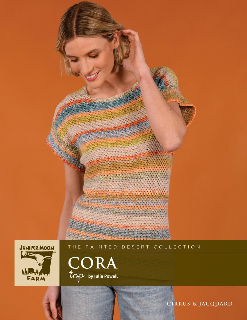 Short T-shirt crocheted in linen stitch, from bottom up, flat pieces are seamed. Sleeve bands are picked up after shoulder joins and single crochet finishes neckline.