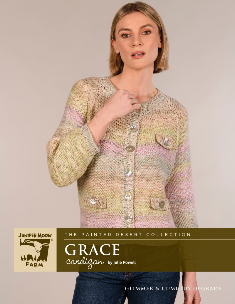 to the hem. Then sleeves are worked in rows to the cuff. The cardigan is worked in reverse Stockinette stitch with ornamental welt pockets.