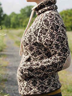 On sleeve, change to larger double-pointed needles when you begin to work the color chart. When sweater is finished, un-zip provisional cast-ons and tack live stitches down to WS of garment, folding at turning round. |