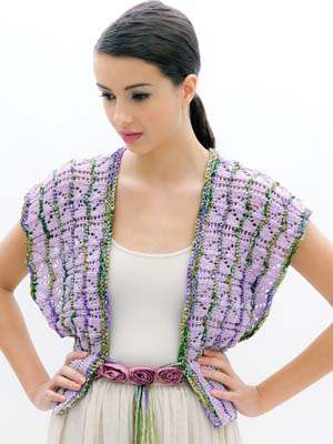 This design is featured in Etcetera, a book from Louisa Harding, and uses Louisa Harding yarn including Sari Ribbon (100g version), and Mila