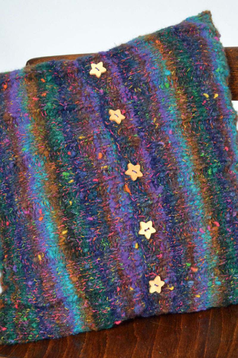 This design is featured in What Can I Knit Tonight? by Jo Allport, a book from Noro, and uses Noro yarn including Mossa
