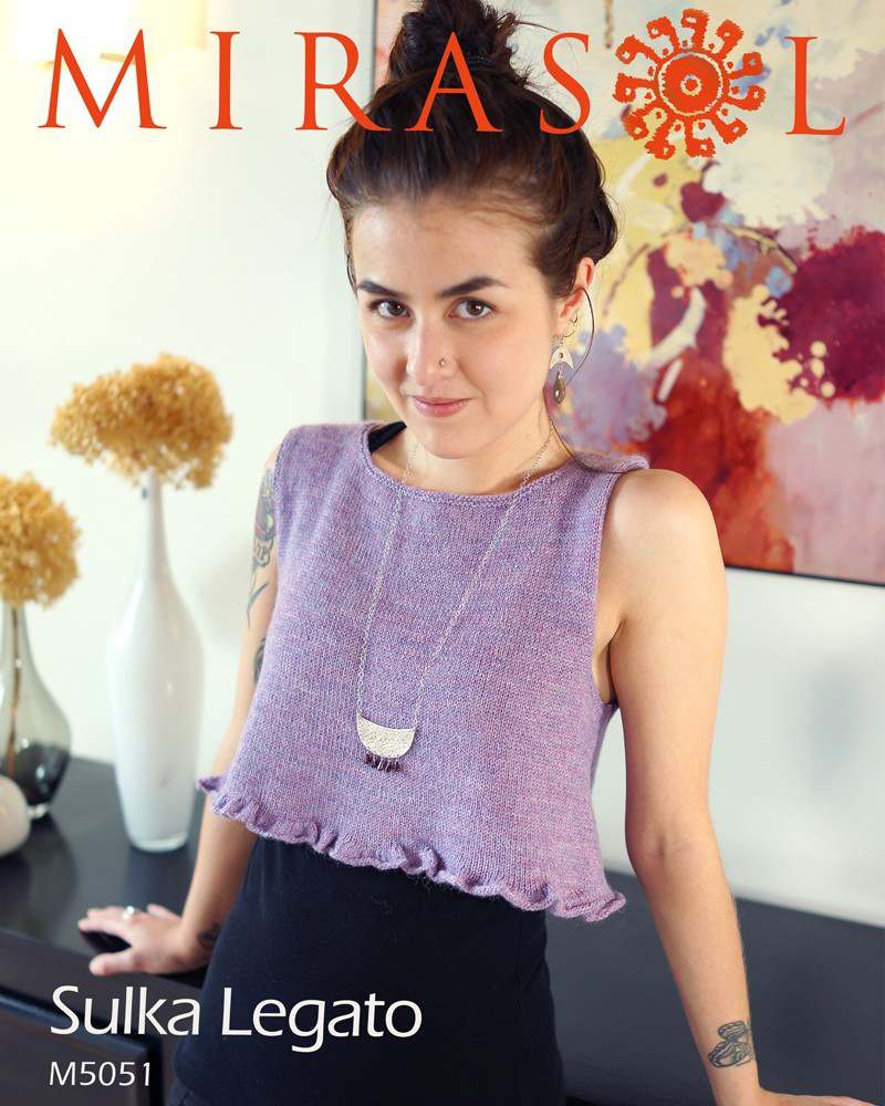 This design is featured in Sulka Legato - Flirty Top, a leaflet from Mirasol, and uses Mirasol yarn including Sulka Legato