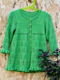 MadorlaLeaf and Bobble Rib worked back and forthRows 1 and 3: Edge st, [k3, p1] 2 (3) 4 (5) times, k3, p5, * k3, p1, k3, p5; repeat from *, ending last repeat with [k3, p1] 2 (3) 4 (5) times, k3, edge st.Rows 2 and 4: Edge st, [p1, p1] 5 (7) 9 (11) times, p1, k5, * p1, [k1, p1] 3 times, k5; repeat from * and end with p1, [k1, p1] 5 (7) 9 (11) times, edge st.Row 5: Edge st, [k3, p1] 2 (3) 4 (5) times, k3, p2, (k1, p1, k1) into the same st, p2, * k3, p1, k3, p2, (k1, p1, k1) into the same st, p2; repeat from * and end with [k3, p1] 2 (3) 4 (5) times, k3, edge st.Row 6: Edge st, [p1, p1] 5 (7) 9 (11) times, p1, k2, p3, k2, * p1, [k1, p1] 3 times, k2, p3, k2; repeat from * and end with p1, [k1, p1] 5 (7) 9 (11) times, edge st.Rows 7 and 9: Edge st, [k3, p1] 2 (3) 4 (5) times, k3, p2, k3, p2, * k3, p1, k3, p2, k3, p2; repeat from * and end with [k3, p1] 2 (3) 4 (5) times, k3, edge st.Rows 8 and 10: Work as for Row 6.Row 11: Edge st, [k3, p1] 2 (3) 4 (5) times, k3, S2Kp2, * k3, p1, k3, S2Kp2; repeat from * and end with [k3, p1] 2 (3) 4 (5) times, k3, edge st.Row 12: Work as for Row 2.Repeat these 12 rows.This means that after working Row 2 you have 11 (15) 19 (23) ribbed sts inside the edge st at each side and 5 panels of 5 sts each in reverse stockinette with 7 ribbed sts between.