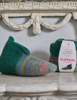 There is nothing like a pair of homemade felted slippers. Made of 100% mulesing-free wool, you can create two identical, warm, comfortable and fashionable slippers from a single ball of yarn. The combination of single colors and multicolored stripes, make each pair of slippers unique and original. The warm shades add liveliness and personality. Its special untreated fibre is advantageous to felting and makes this yarn suitable for fashion accessories as well as small home decor projects.